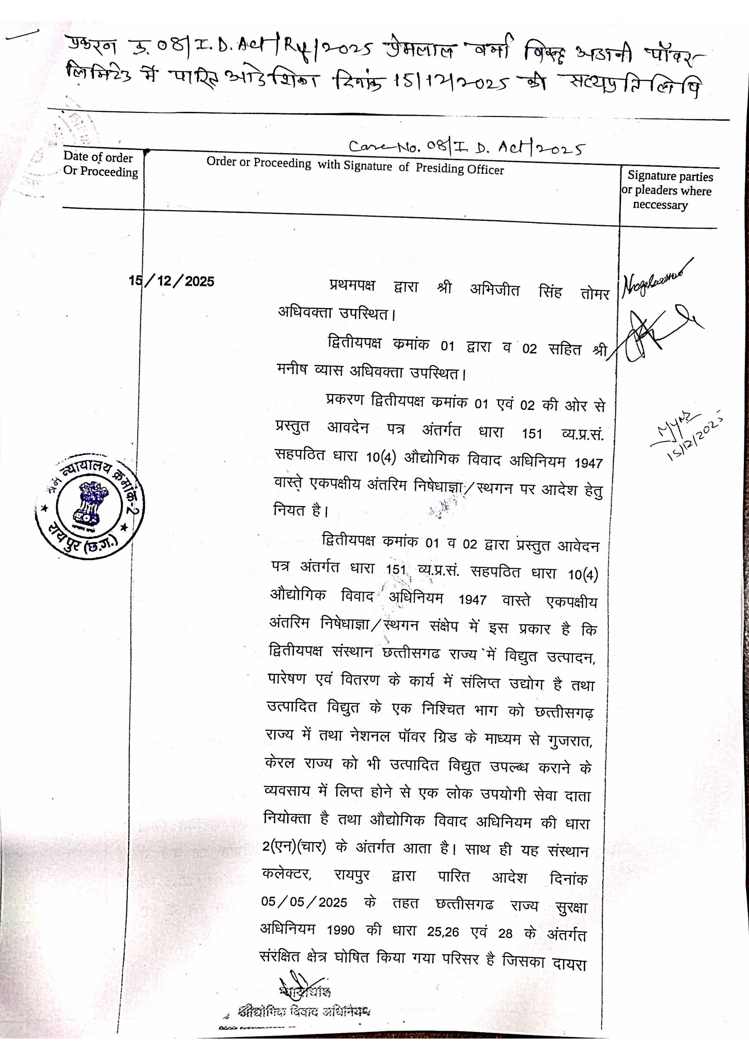 जनहित को ध्यान रख अदाणी पावर श्रमिकों की हड़ताल न्यायालय द्वारा छह माह तक की प्रतिबंधित